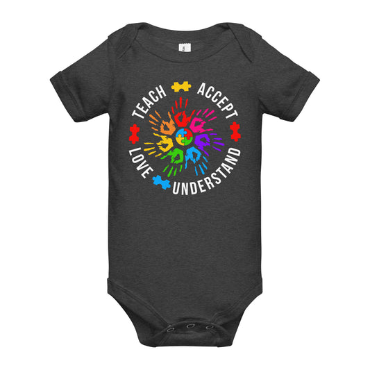 Teach Accept Understand Love Autism Bella Canvas Baby Onesie