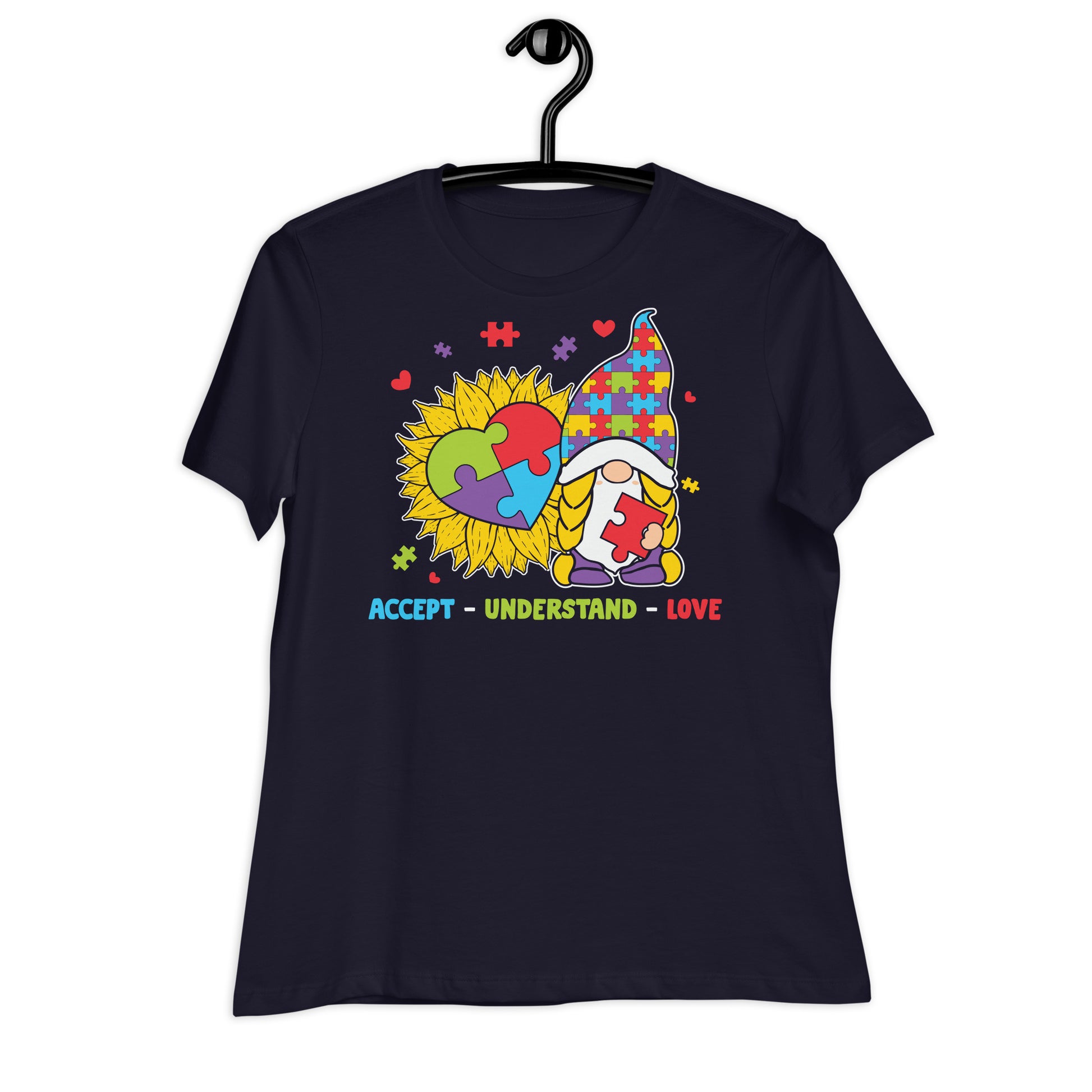 Introducing our Accept Understand Love Autism Gnome Bella Canvas Relaxed Women's T-Shirt. This shirt is not just a piece of clothing, it's a statement of acceptance, understanding, and love for individuals with autism. With its comfortable fit and high-quality material, this shirt is perfect for everyday wear while spreading an important message. Show your support and make a difference with this powerful and encouraging design. Let's spread awareness and love together!
