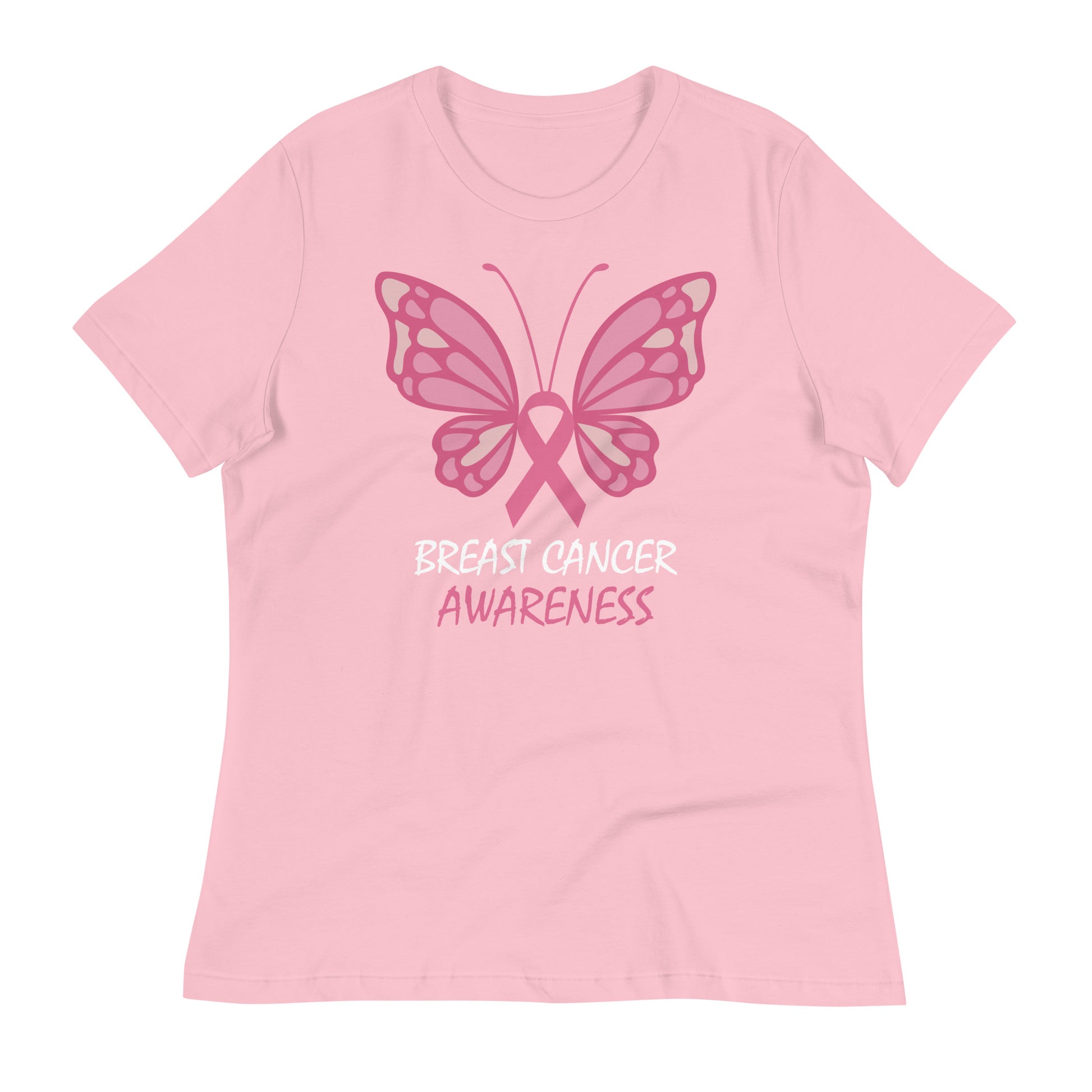 Show your support for breast cancer awareness with this stylish Butterfly Bella Canvas Women's T-Shirt. This shirt is perfect for those who want to spread positivity and encouragement. Perfect for women of all ages, this t-shirt is not only fashionable but also supports a great cause. Stand out in style and make a statement with this eye-catching shirt.