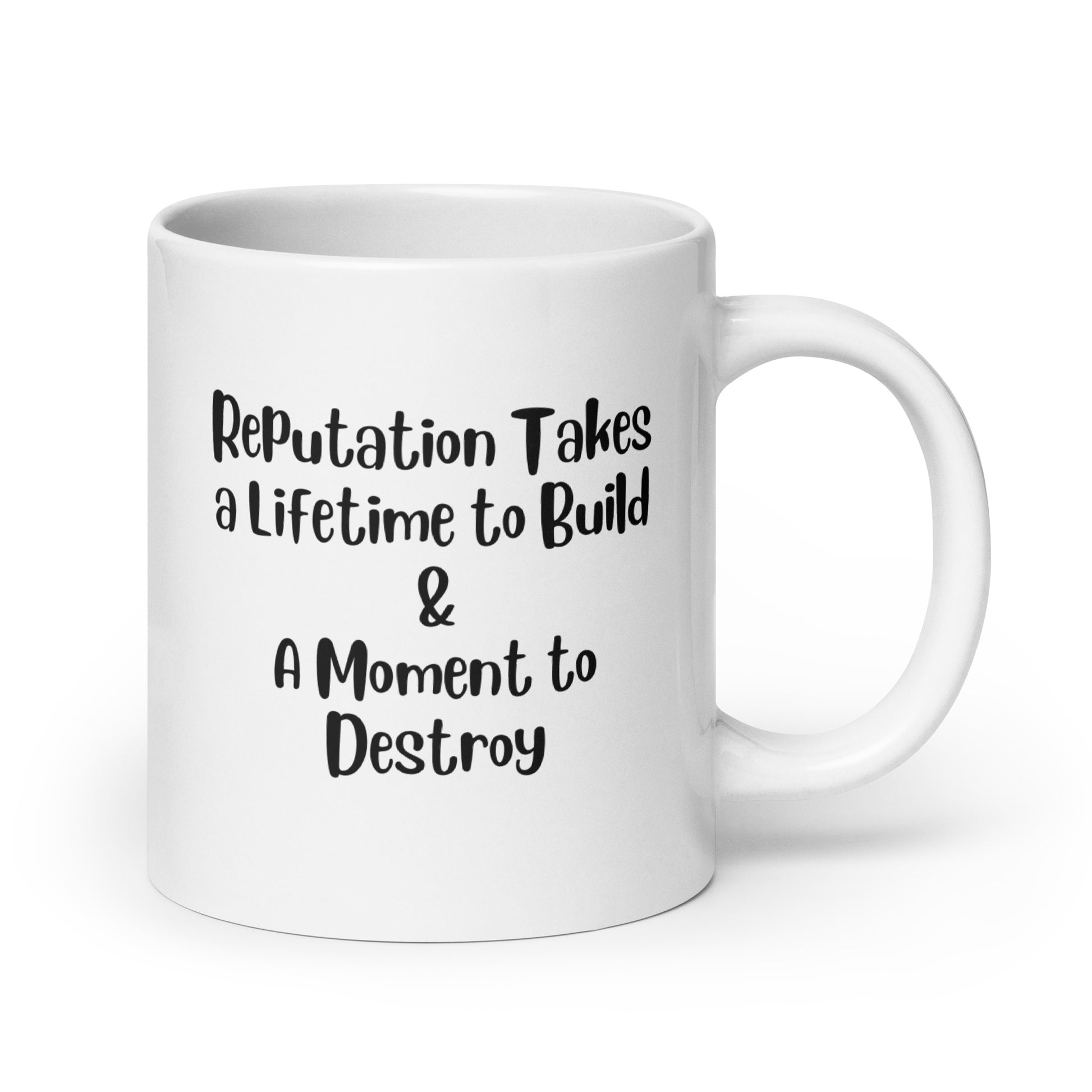 Stand out with this powerful and encouraging mug that serves as a daily reminder of the importance of reputation. Made from high-quality ceramic, this mug is durable and perfect for enjoying your favorite hot beverages. Start your day off right with a cup of coffee in this unique and inspiring mug. Make a statement with your drinkware and show the world that reputation truly does take a lifetime to build.
